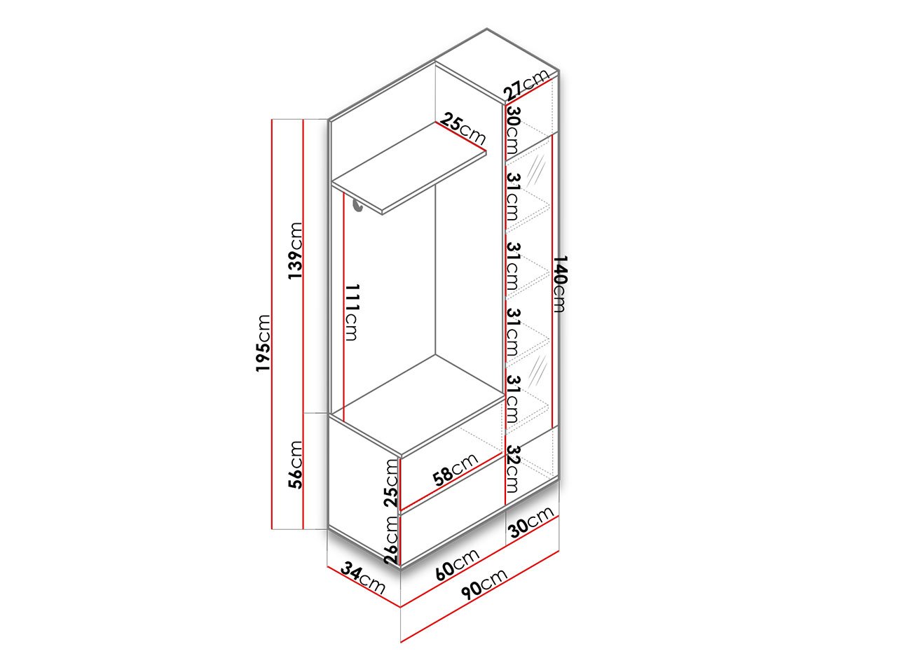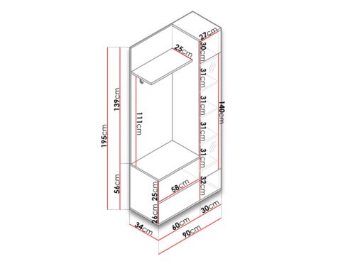 מידות: רוחב: 90 ס”מ / גובה: 195 ס”מ / עומק: 34 ס”מ