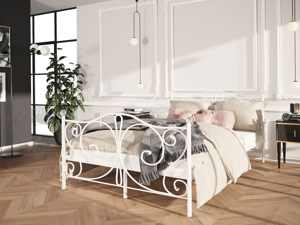 מיטת מתכת דקורטיבית דגם Drekolsi בעלת אווירה יוצאת דופן לחדר השינה. דקורטיבי ופרקטי בו זמנית. היא כבר כבשה לבבות רבים של אוהבי שילוב מודרניות עם רוח הצורות הקלאסיות.