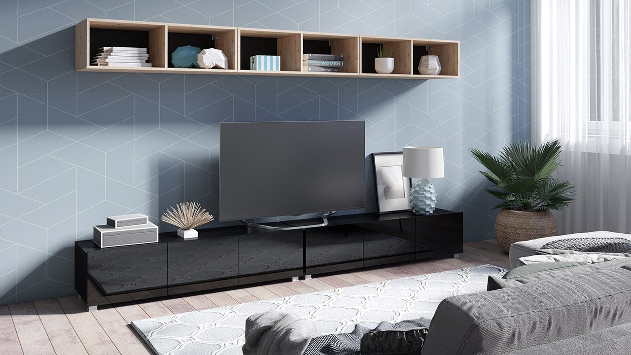 - ארון טלוויזיה עומד (רגליים כסופות 5 ס”מ) או תלוי לבחירה