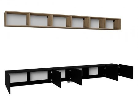 מדפים וארון טלוויזיה לאחסון בשילוב עץ אלון. מתאים במיוחד סביב טלוויזיה.