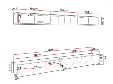 | מידות | ארון טלויזיה: רוחב: 150 ס"מ/ גובה: 37 ס"מ/ עומק: 43 ס"מ, מדף תלוי: רוחב: 100 ס"מ/ גובה: 31 ס"מ/ עומק: 41 ס"מ |