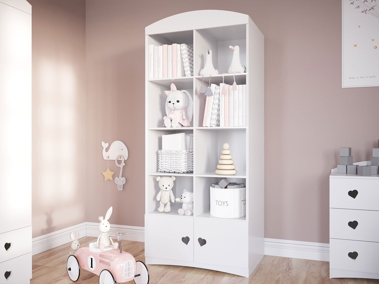 הידיות שולבו בעדינות בצורה של חורים בצורת לב, המעניקים סגנון ייחודי שבתך תאהב! ארון הספרים לחדר ילדים ישמש לאורך זמן רב, הודות לצורתו האוניברסלית, הצבעוניות והשימוש ברכיבים איכותיים בעת ייצורו. מתלה הצעצועים עשוי לוח בטיחותי לחלוטין לילדים.