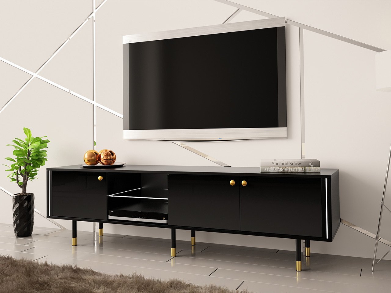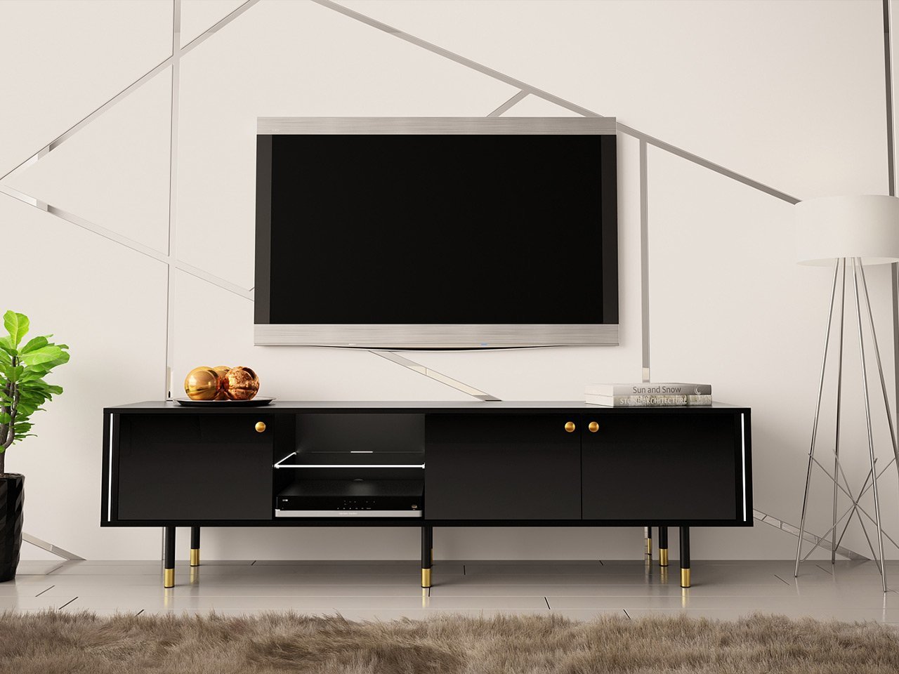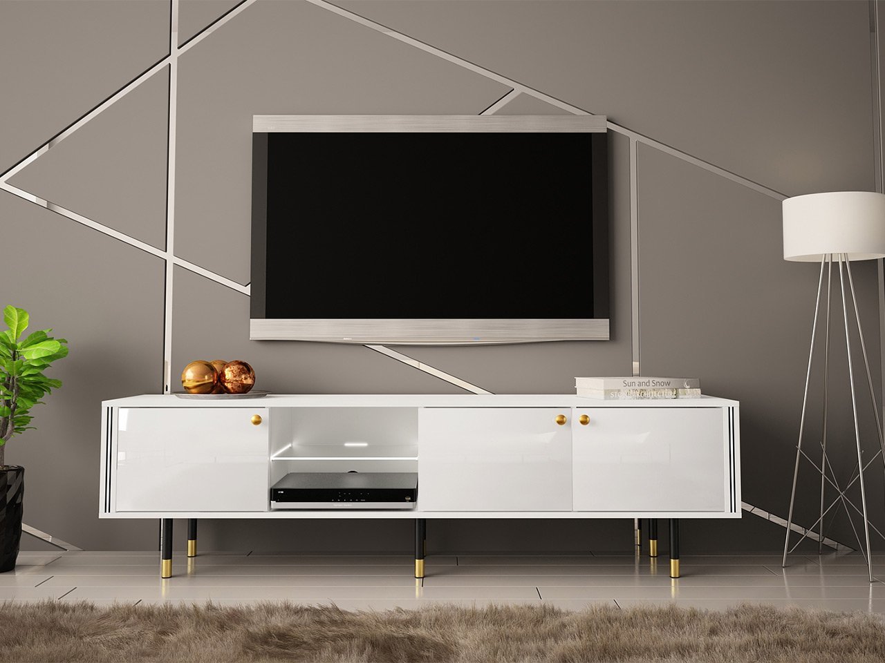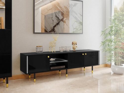שידת טלוויזיה עם תאורת לד המעניקה מראה מודרני מושלם עבור הסלון וחדר השינה. השידה תיצור פינת טלוויזיה אלגנטית בדירה שלך. בעלת גימור גאוני במיוחד ופונקציות מעשיות.