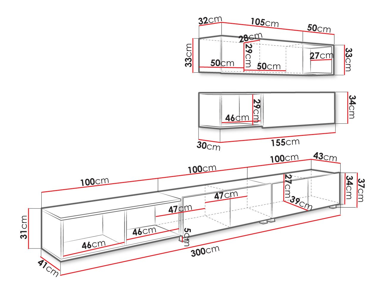 - מזנון טלוויזיה X2: רוחב: 100 ס”מ/ גובה: 37 ס”מ/ עומק: 43 ס”מ