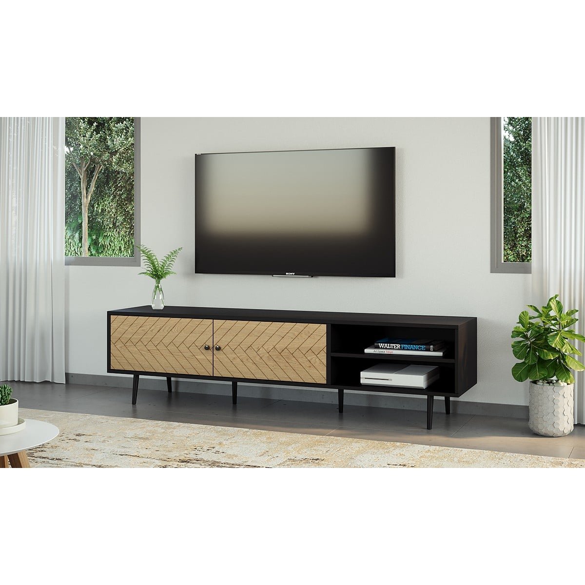 מזנון מודרני מרהיב ברוחב 180 ס”מ בעל שתי דלתות לאחסון ושני מדפים דגם אפולו.