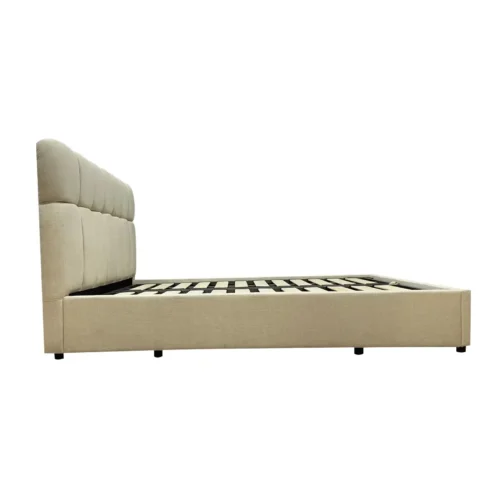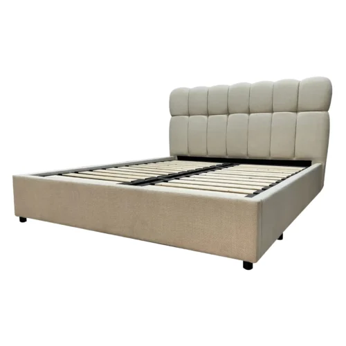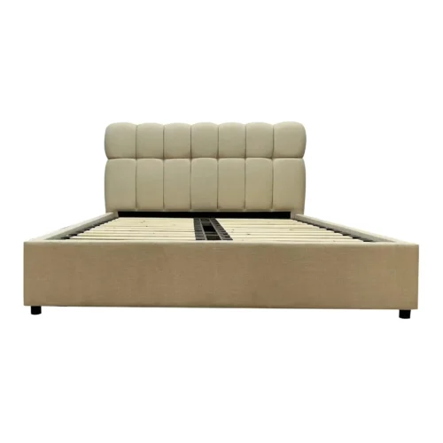 מיטה זוגית עם ראש מיטה מרופד בצבע בז’. מחיר המיטה כולל מזרן וארגז מצעים לאחסון נוח.