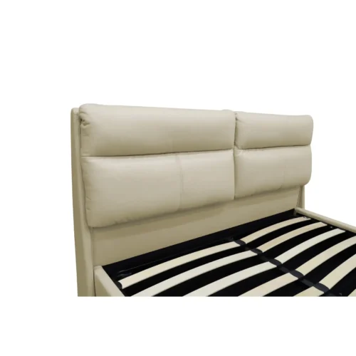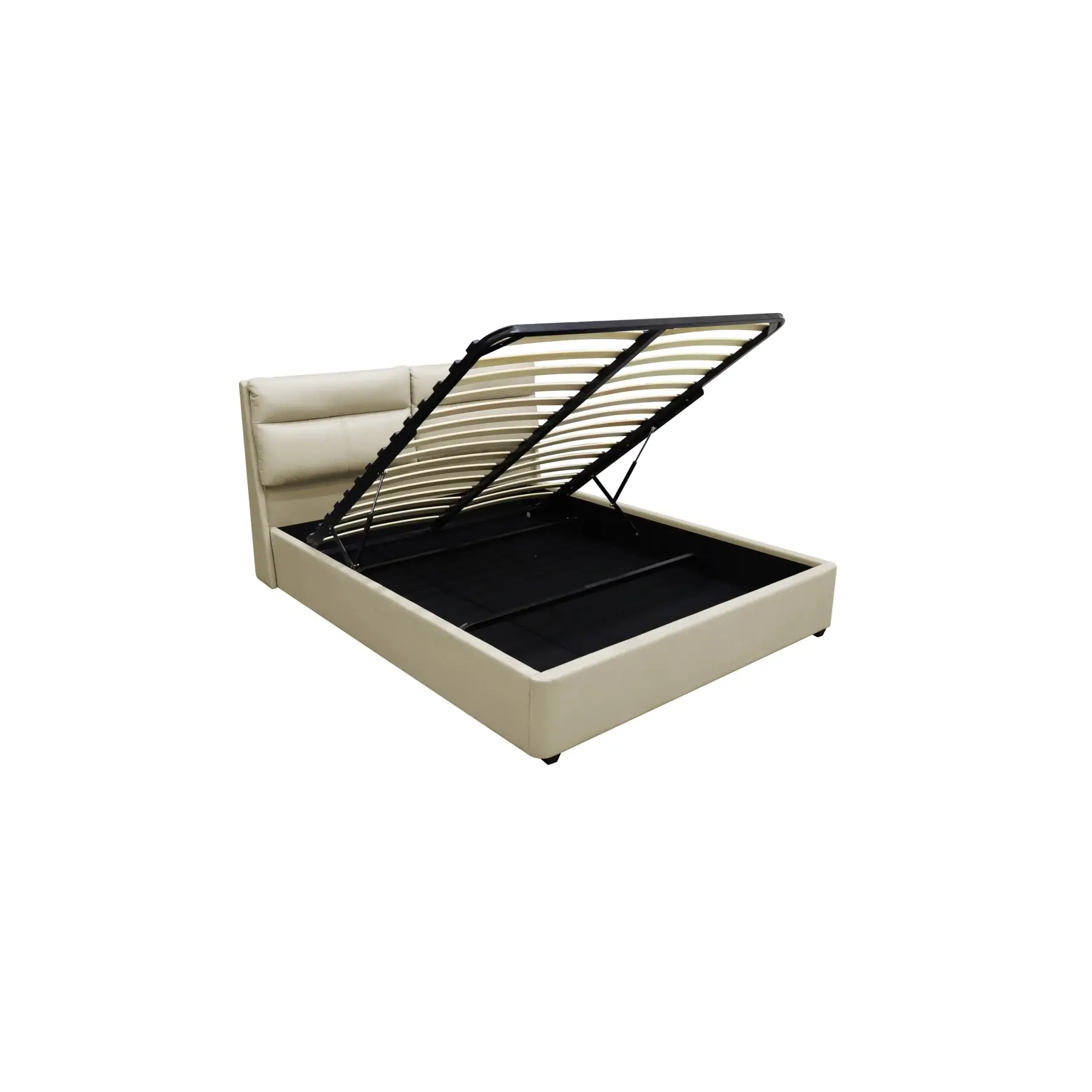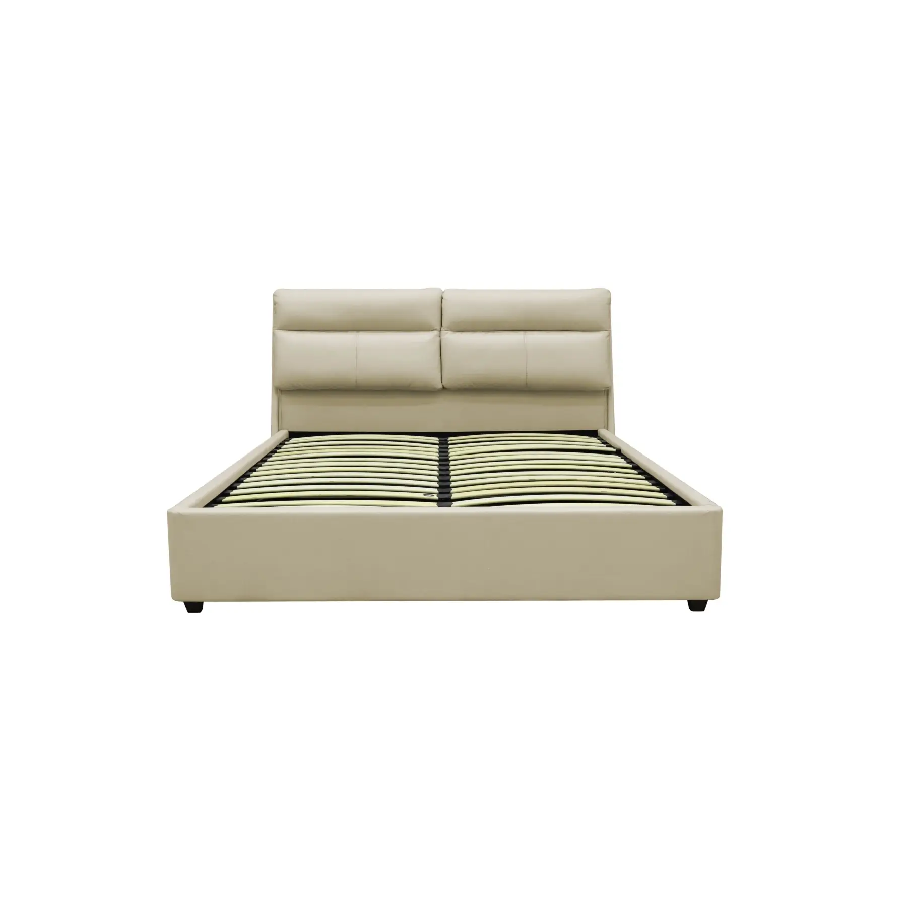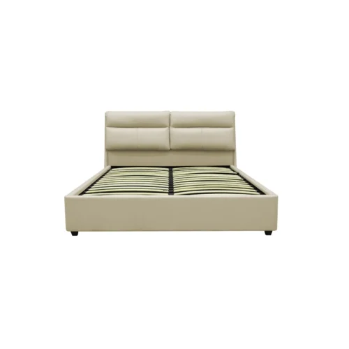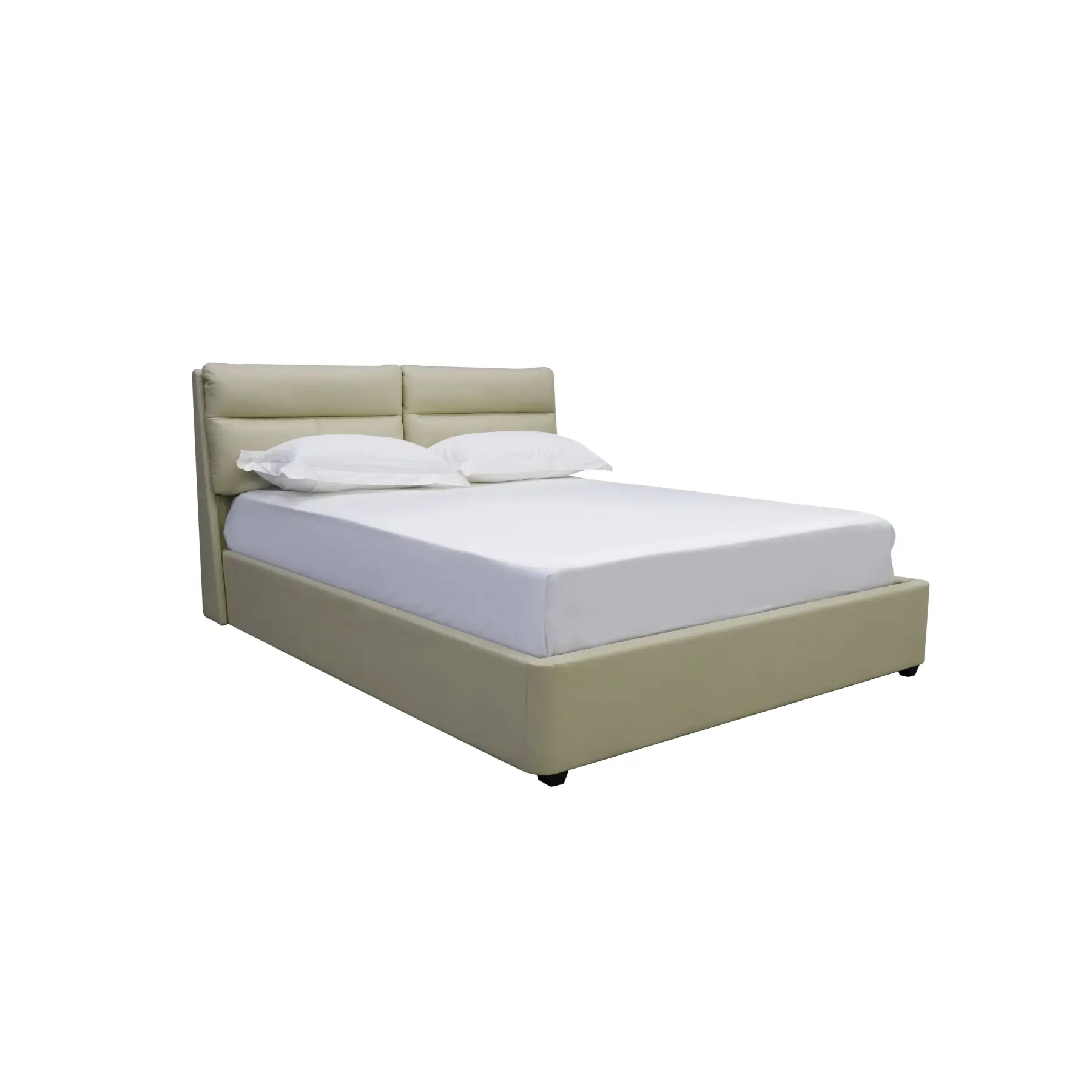 מיטה זוגית עם ראש מיטה מרופד בצבע בז’. מחיר המיטה כולל מזרן וארגז מצעים לאחסון נוח.
