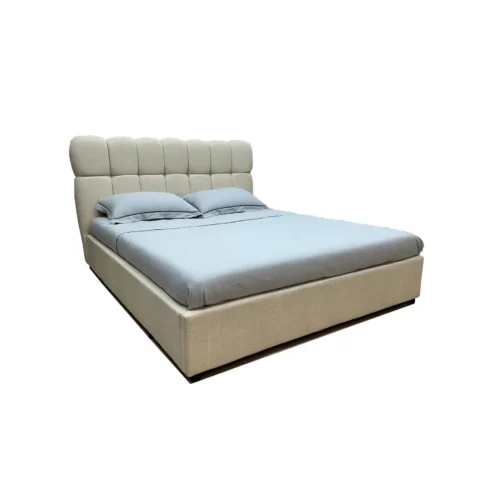 מיטה זוגית עם ראש מיטה מרופד בצבע בז’. מחיר המיטה כולל מזרן וארגז מצעים לאחסון נוח.