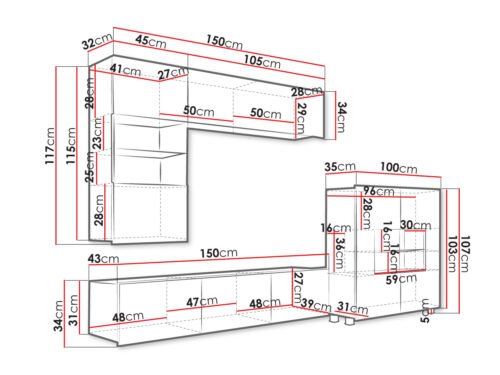 - מזנון טלוויזיה: רוחב: 150 ס”מ/ גובה: 32 ס”מ/ עומק: 43 ס”מ