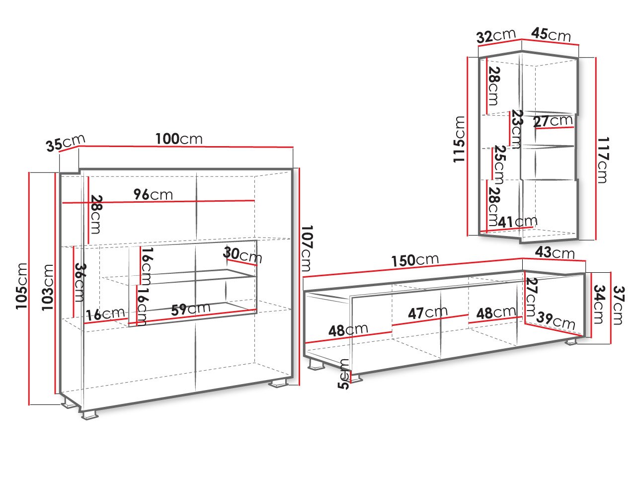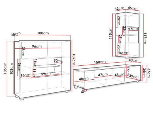 - מזנון טלוויזיה: רוחב: 150 ס”מ/ גובה: 37 ס”מ/ עומק: 43 ס”מ