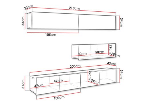 - ארונות תלויים X3: רוחב: 105 ס”מ, גובה: 34 ס”מ, עומק: 32 ס”מ