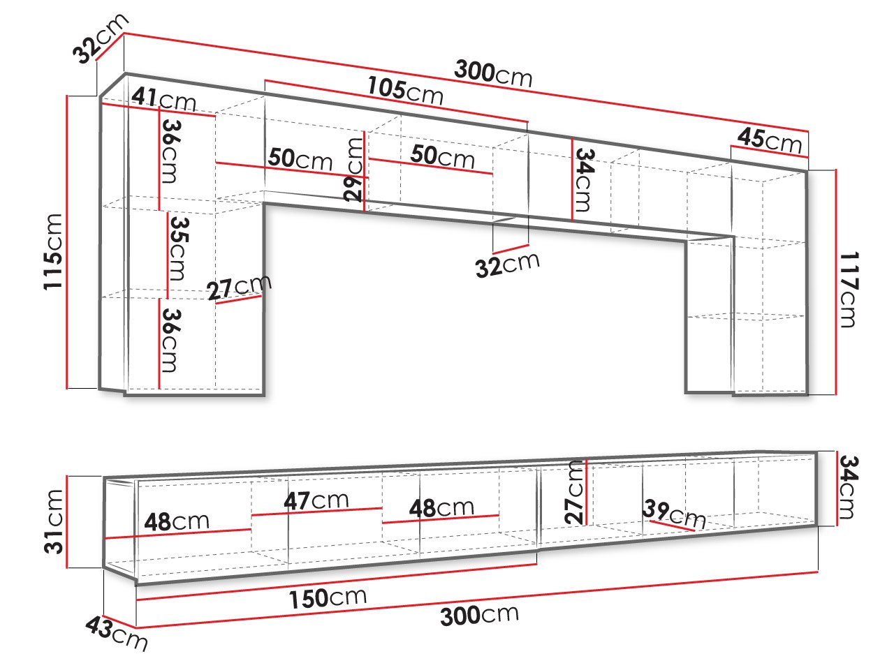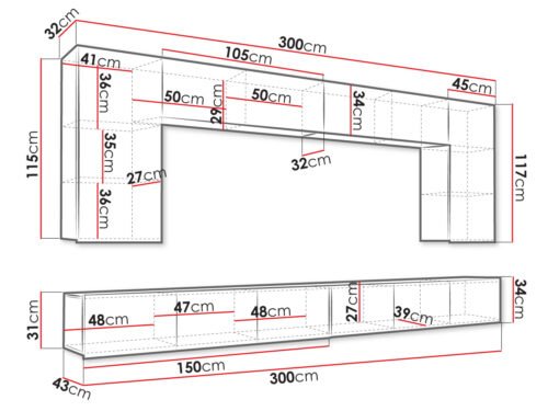 רוחב: 150 ס”מ/ גובה: 32 ס”מ/ עומק: 43 ס”מ - ארונות תלויים לאורך X2: