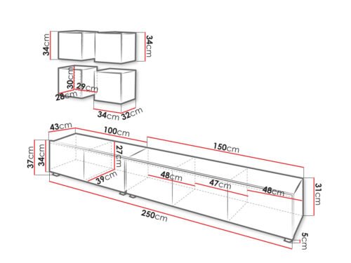 - ארון טלוויזיה: רוחב: 150 ס”מ/ גובה: 37 ס”מ/ עומק: 43 ס”מ