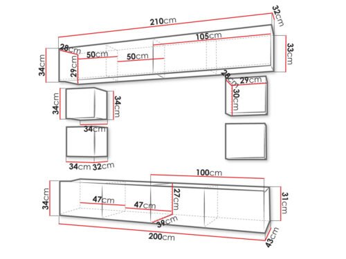 - מדף תלוי X2: רוחב: 105 ס”מ/ גובה: 34 ס”מ/ עומק: 32 ס”מ