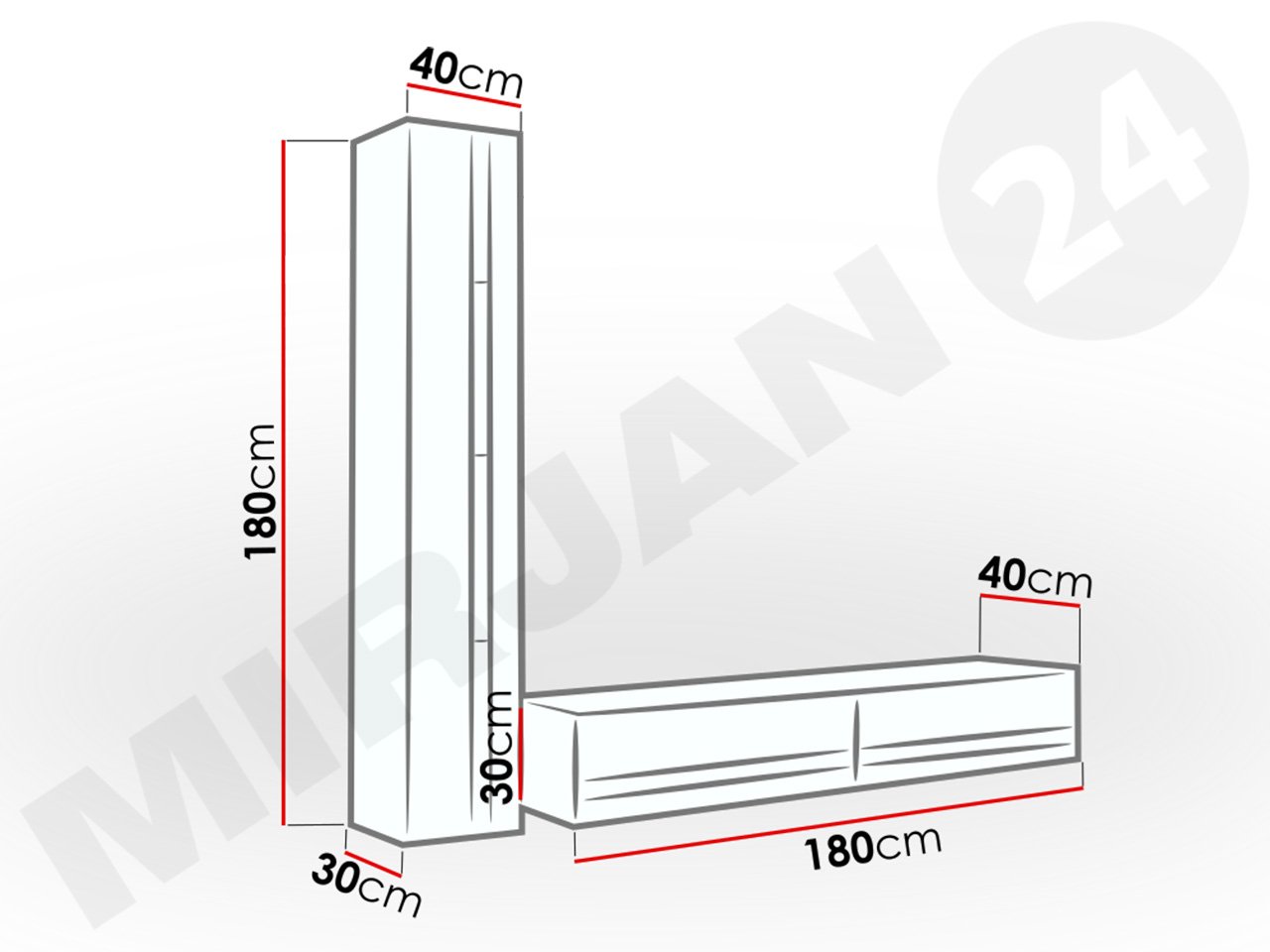 - מזנון טלוויזיה : רוחב: 180 ס”מ/ גובה: 30 ס”מ/ עומק: 40 ס”מ