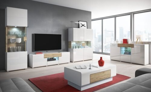 סט הרהיטים של Toledo WM III היא הצעה מהממת להרכבת סלון מודרני. הפריטים מאופיינים בסגנון מינימליסטי ובגימור מבריק של החזיתות. בעל שילוב דמוי מרקם עץ מעניין.