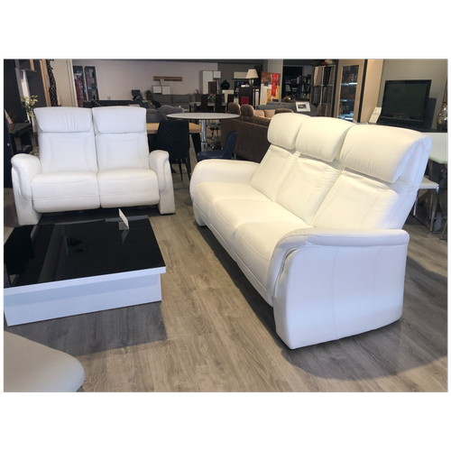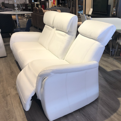 סט ספות דו מושבי ותלת משובי לסלון מעור מלא בצבע לבן כולל משענות ראש מתכווננות ו3 ריקליינרים.