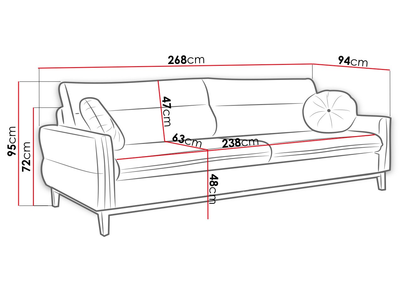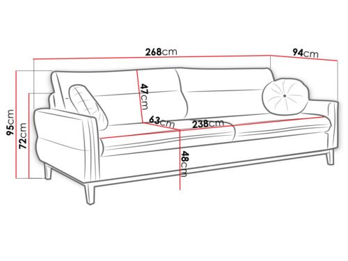 - גודל ספה אורך: 268 ס”מ / רוחב: 94 ס”מ / גובה: 95 ס”מ