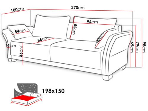 - גודל ספה אורך: 270 ס”מ / רוחב: 100 ס”מ / גובה: 98 ס”מ