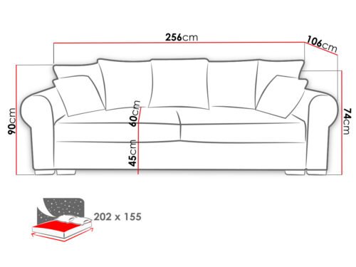 - גודל ספה אורך: 256 ס”מ / רוחב: 106 ס”מ / גובה: 90 ס”מ