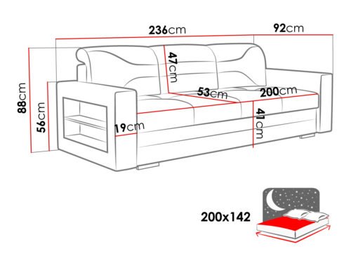 - גודל ספה אורך: 236 ס”מ / רוחב: 92 ס”מ / גובה: 88 ס”מ