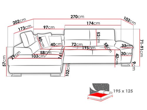 - מידות ספה: אורך: 270 ס”מ / רוחב: 202 ס”מ / גובה: 71 – 91 ס”מ