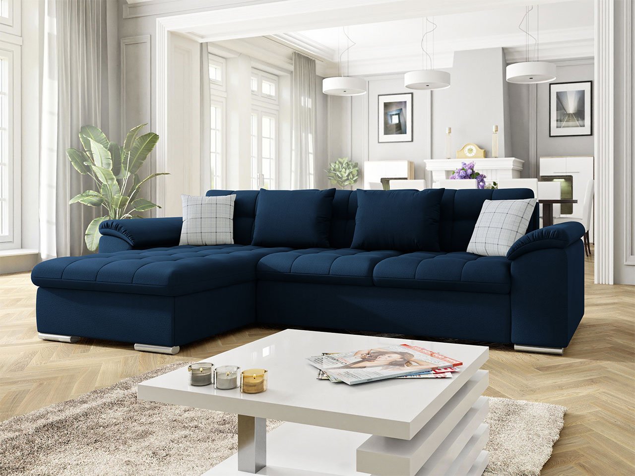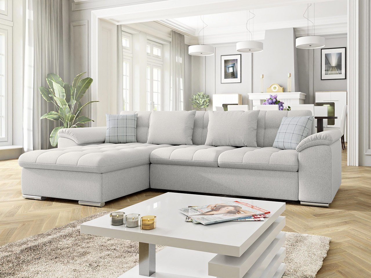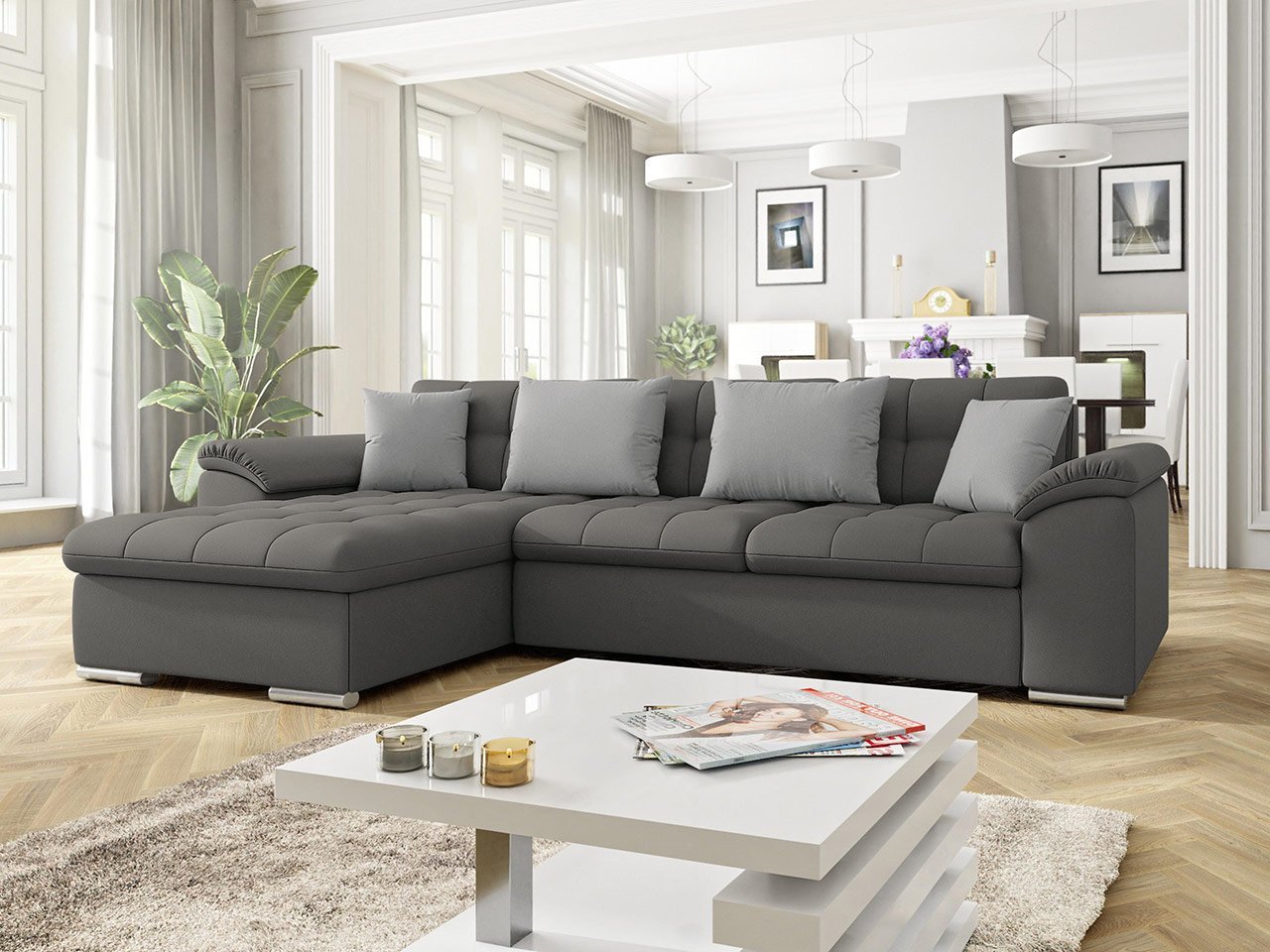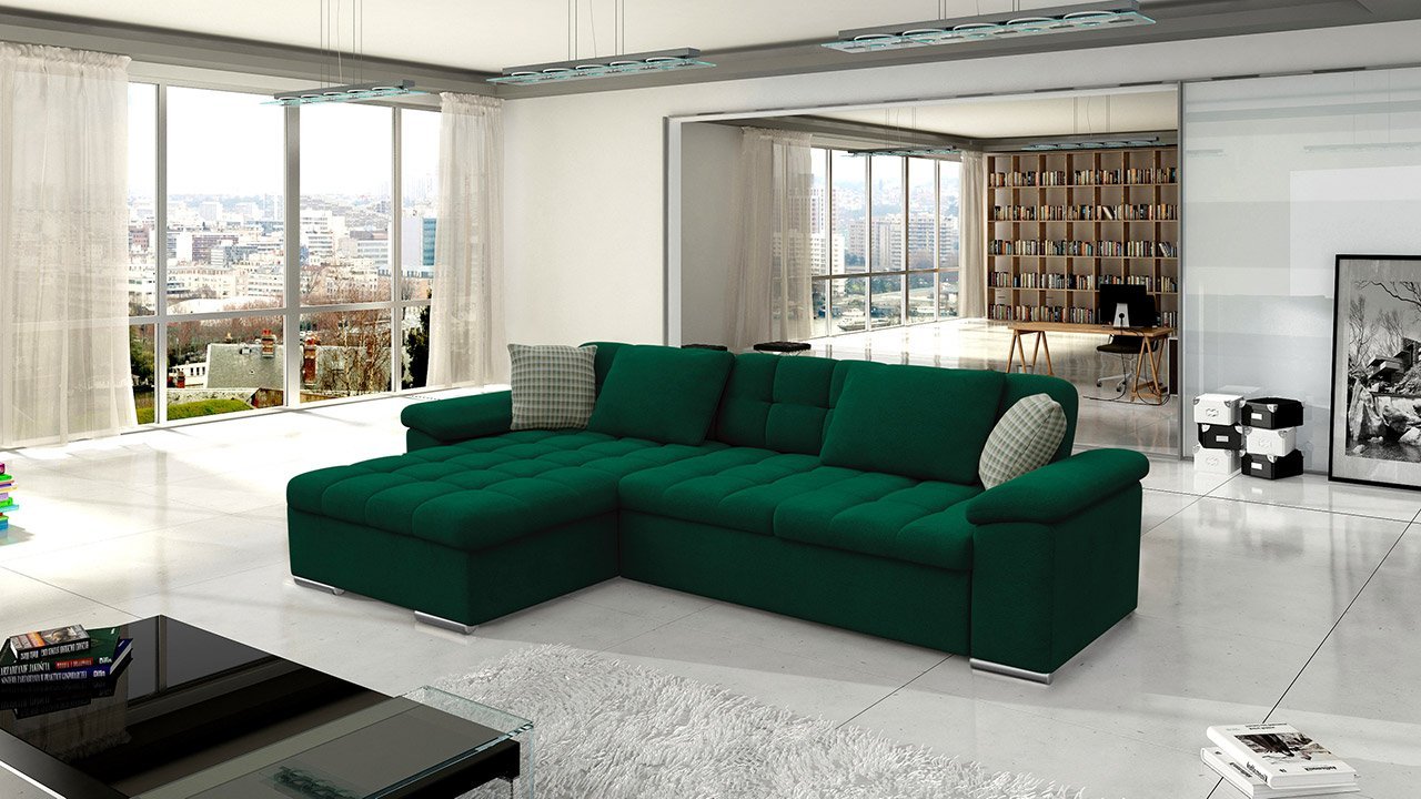 ספה פינתית בצורת L נפתחת למיטה+ ארגז אחסון! בעלת רכות מושלמת! עם משענות ראש מתכווננות. ורגליים מעוצבות