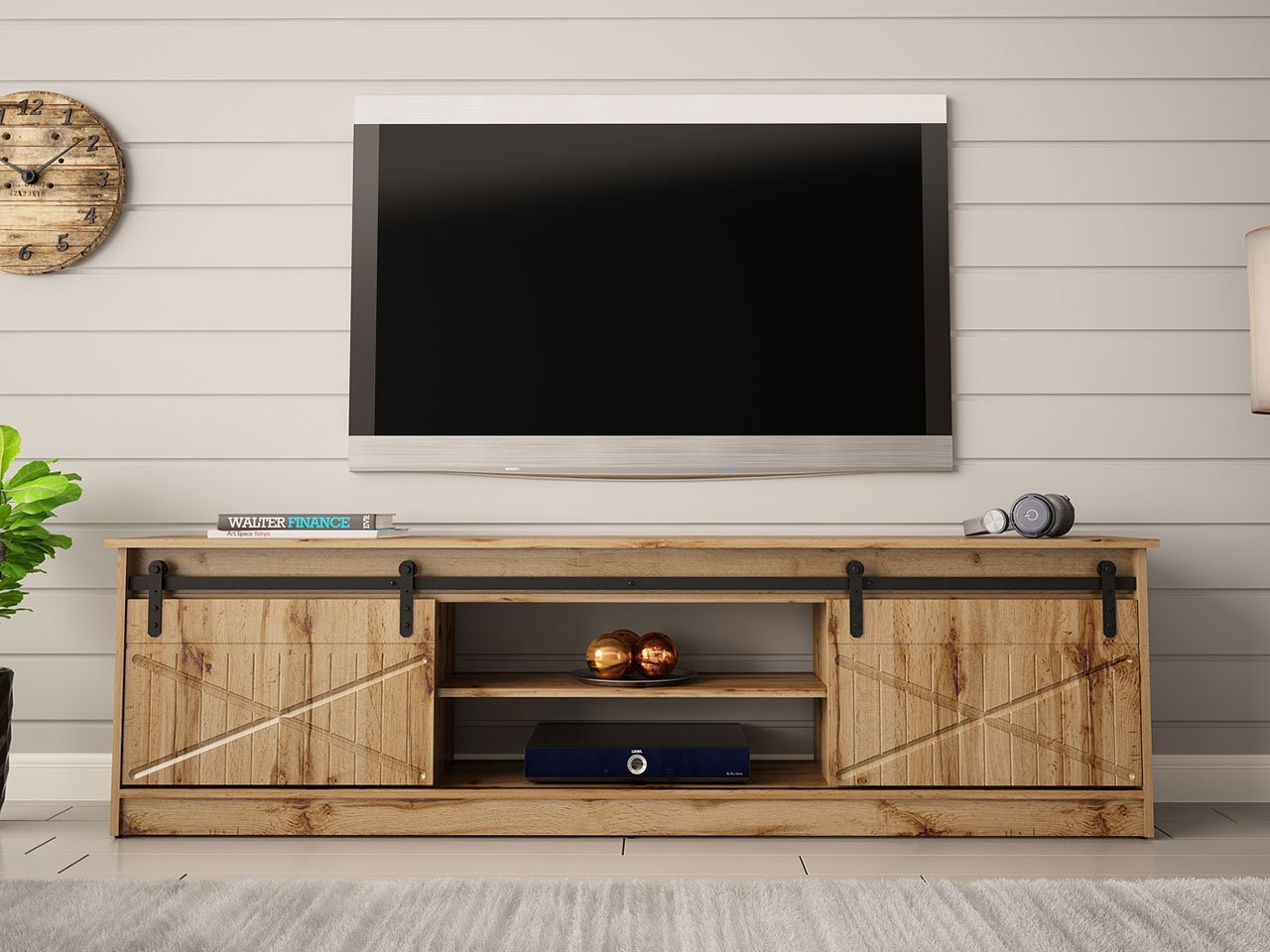 שידת הטלוויזיה Sarinero יגרום לחדר שלך לזרוח. חזיתות יפהפיות המזכירות קוטג’ הררי אטמוספרי, עשוי מאלמנטים מעץ.