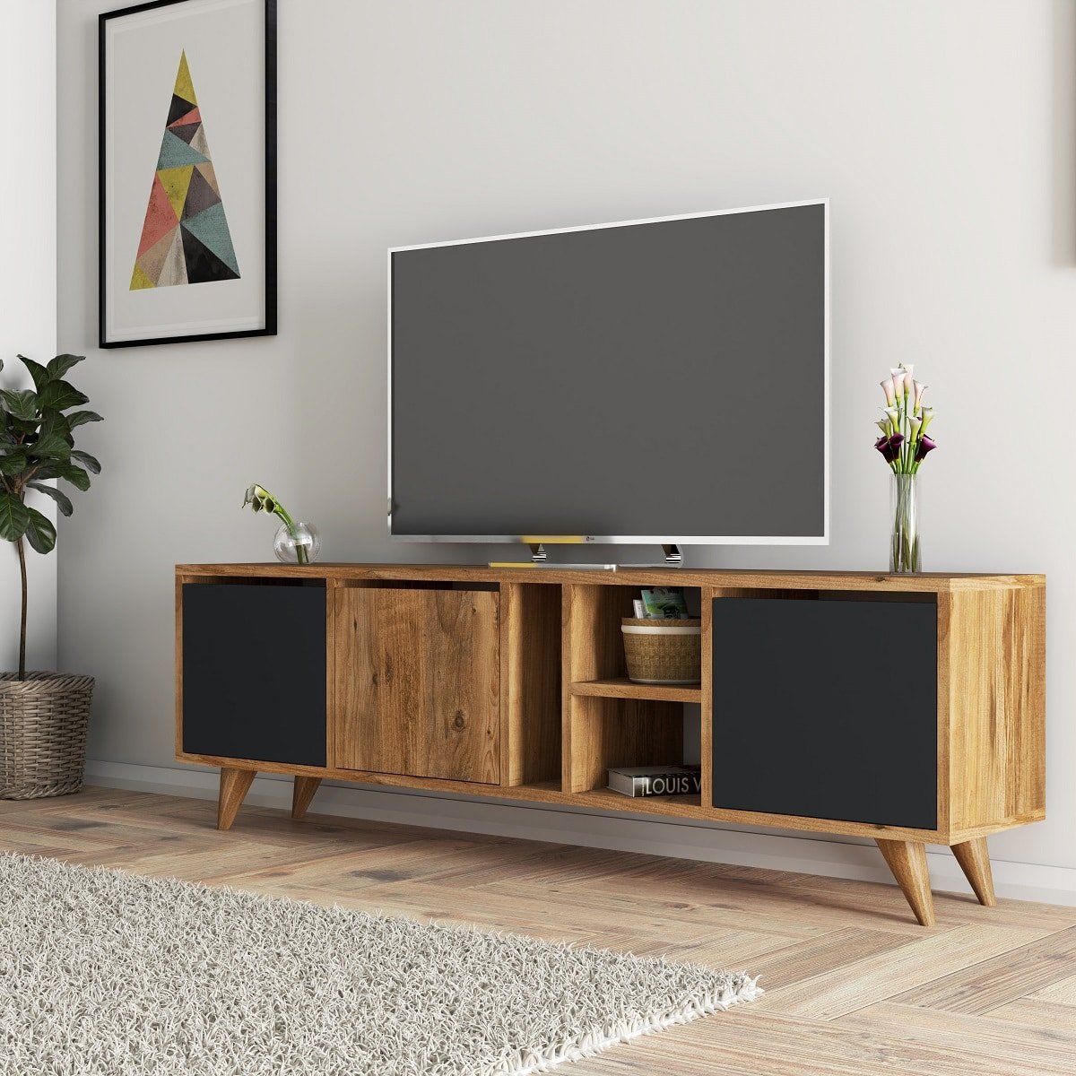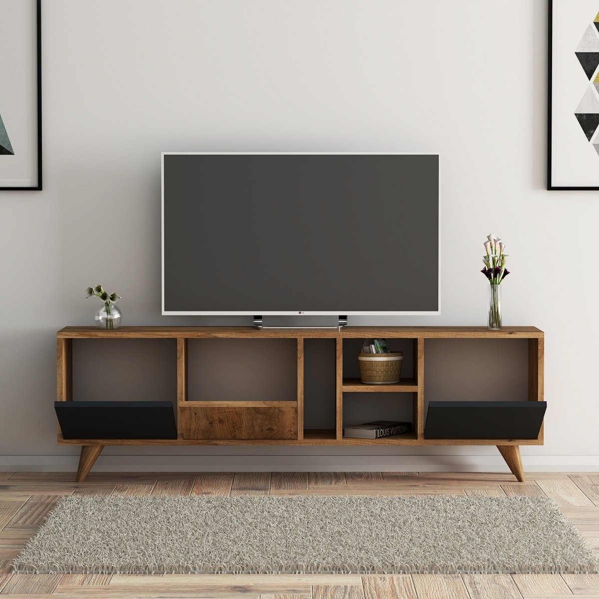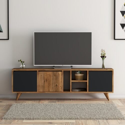 מזנון טלויזיה מעוצב ברוחב 150 ס”מ בגוון אגוז בשילוב שחור דגם מיקונוס.